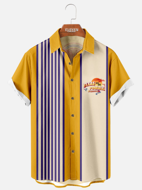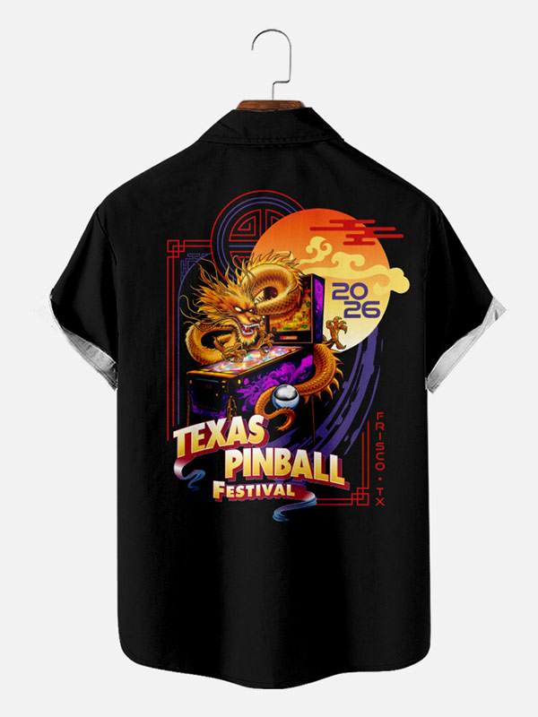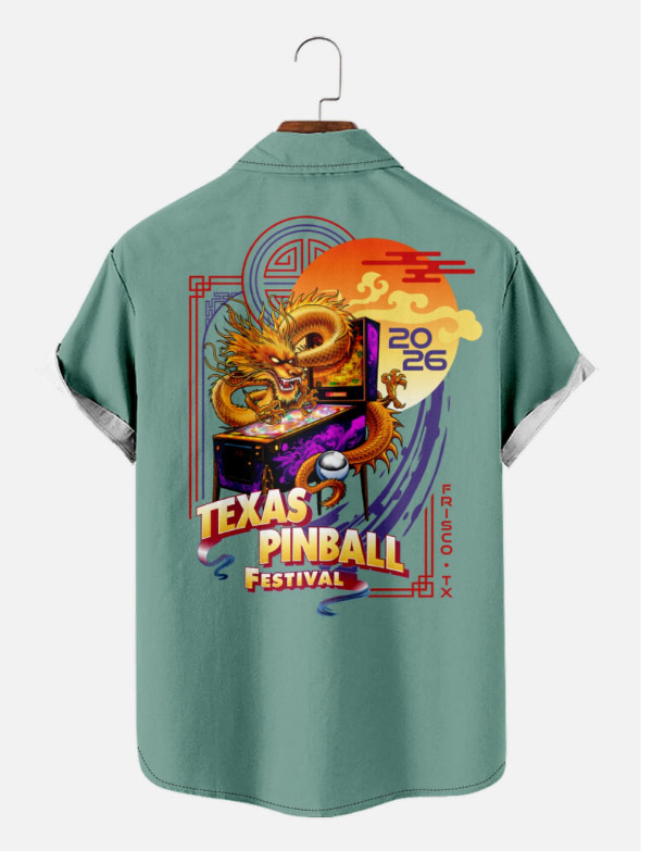 The TPF Bowling Shirt features the Texas Pinball Festival logo is prominently displayed on the back of the shirt with additional 2026 art on the front right.